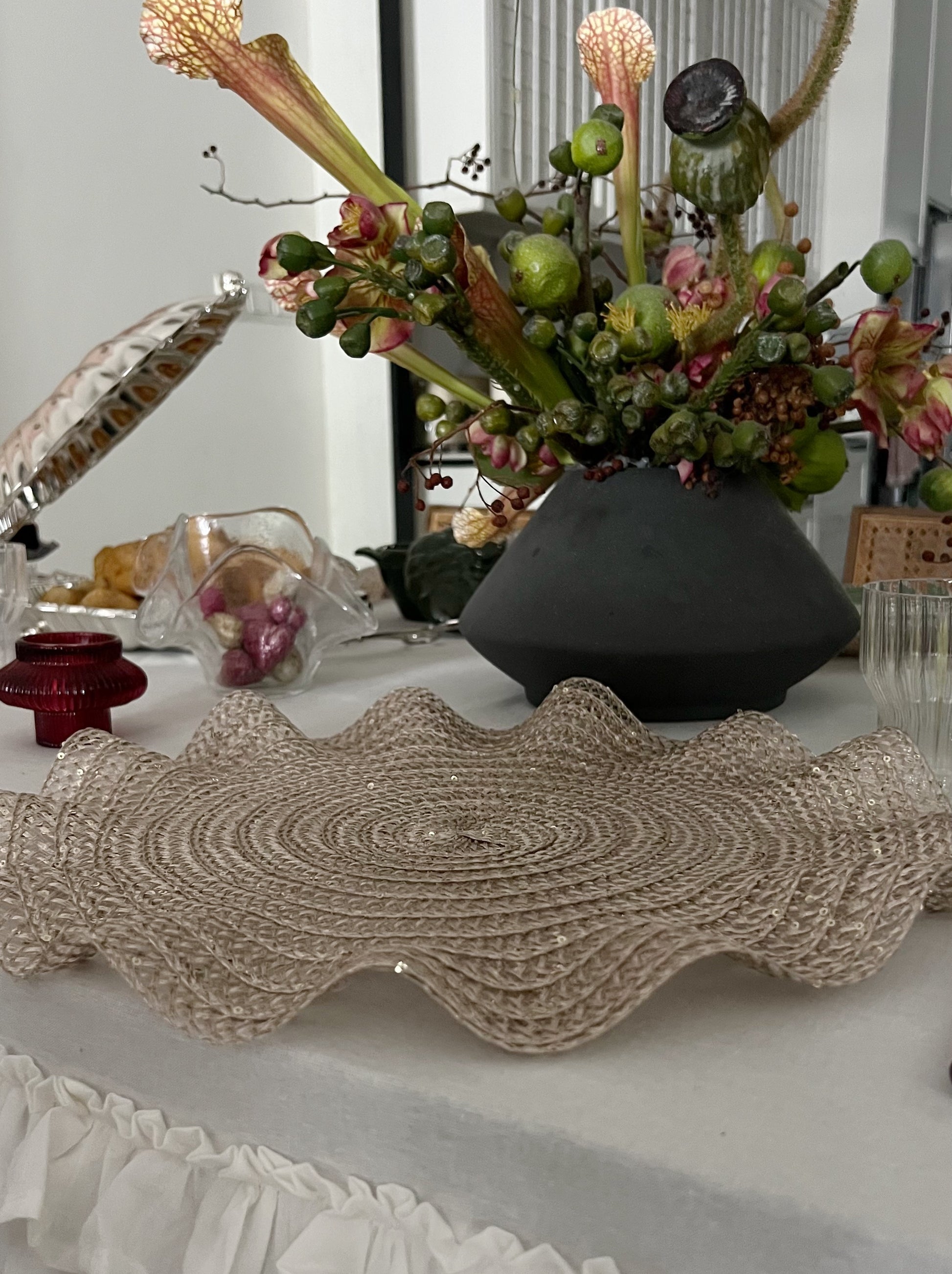 Made with heat-resistant and anti-skid material, this placemat offers not only aesthetic enhancement, but also practicality for your dining experience. Add a touch of sophistication to your next meal with the Shimmer Ruffles Placemat.
